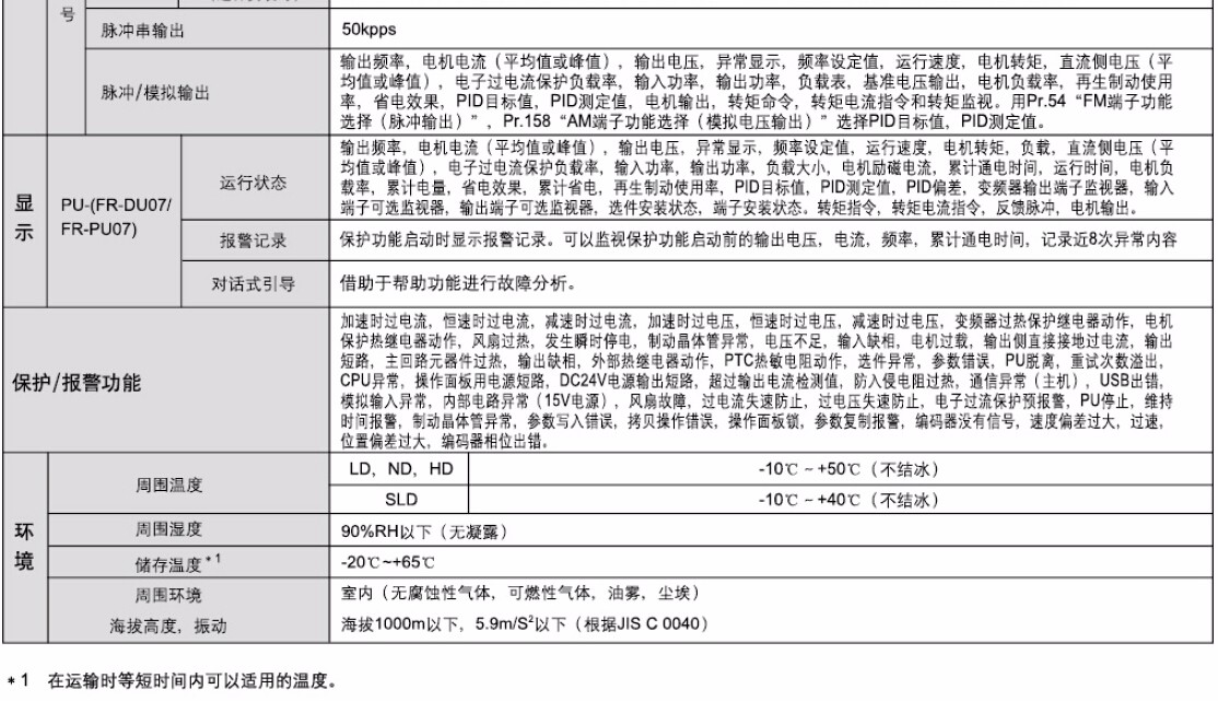 ■三菱变频器FR-A740驱动带编码器的电机实现高性能的矢量控制:闭环矢量控制下,变频器可达到比无传感器矢量控制时更高精度和更快速度响应的性能。速度控制范围 1:1500;速度波动率:0.01%;速度响应 300rad/s。转矩控制范围 1:50;并具零速控制和伺服锁定功能。位置控制中,内置15段预设位置段,并且可与PLC或脉冲单元连接后可构成通用伺服系统,实现定位操作。若选用三菱专用电机,可实现低速时连续输出100%转矩,适合于开卷/收卷等场合。